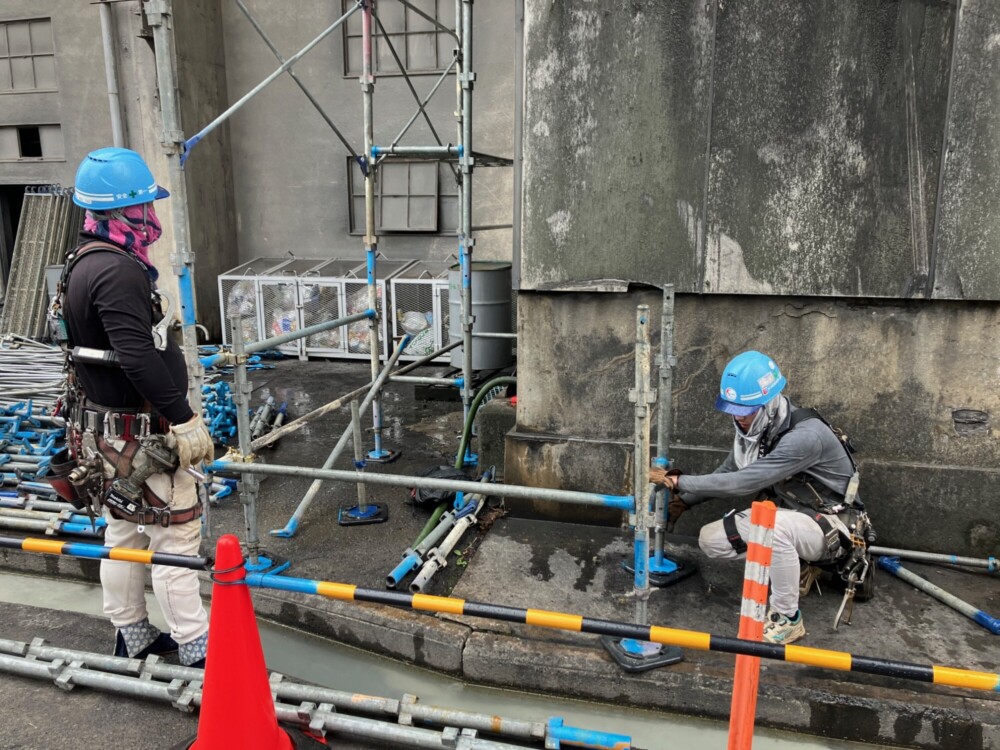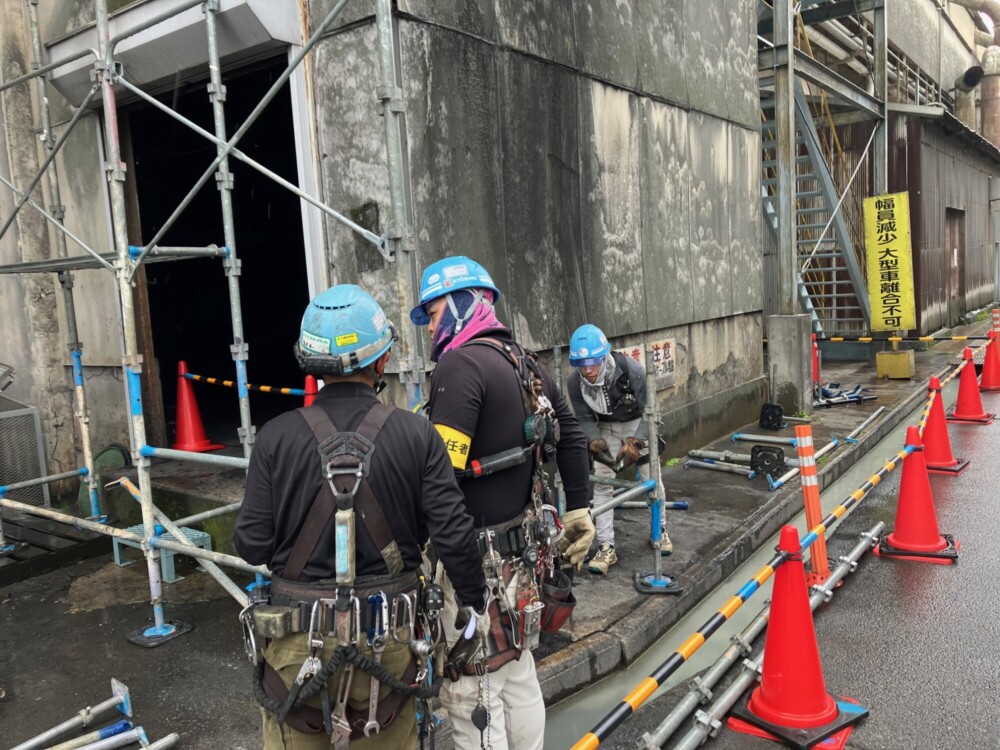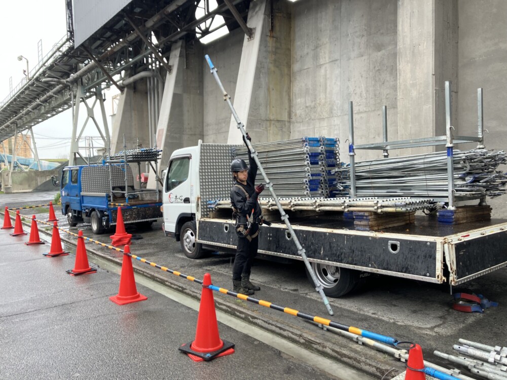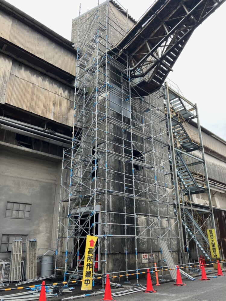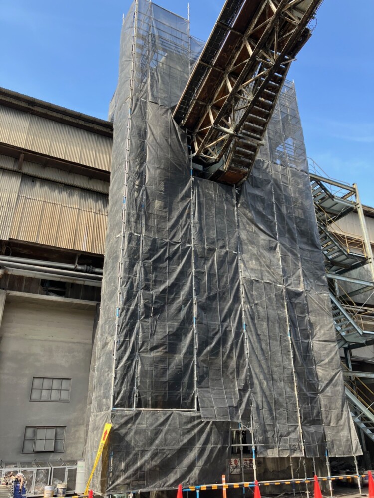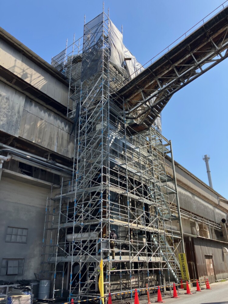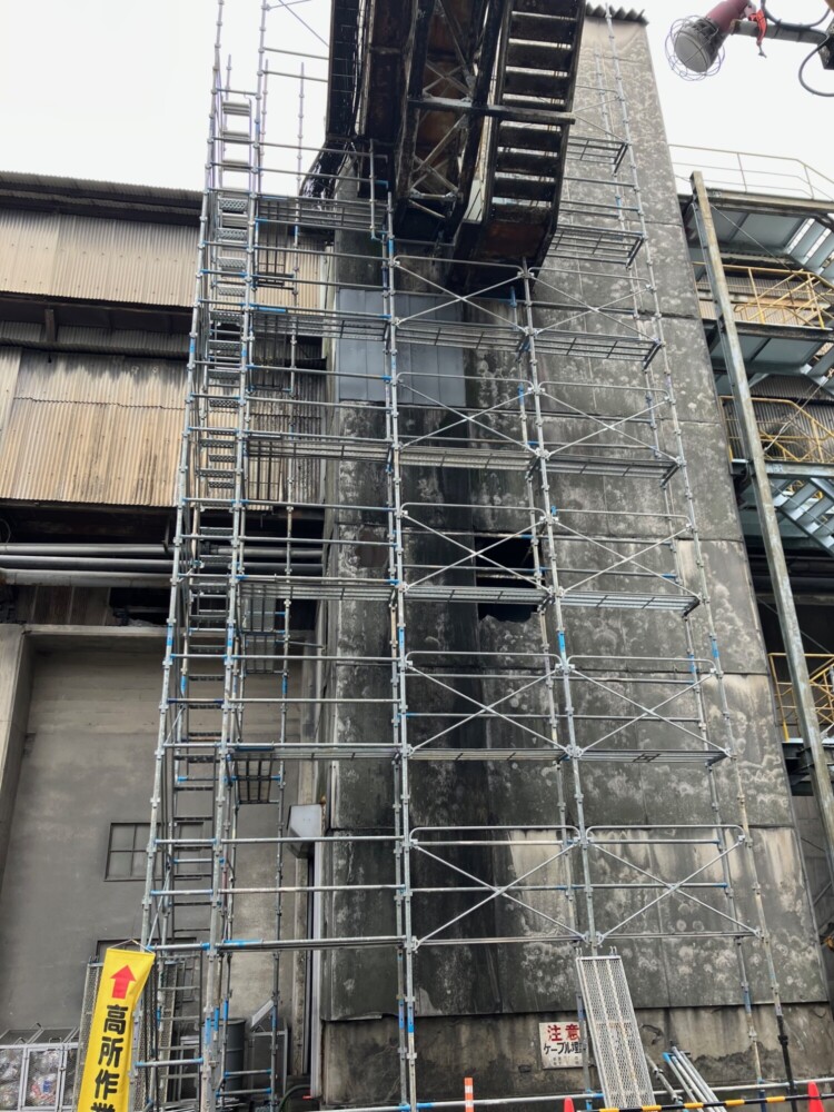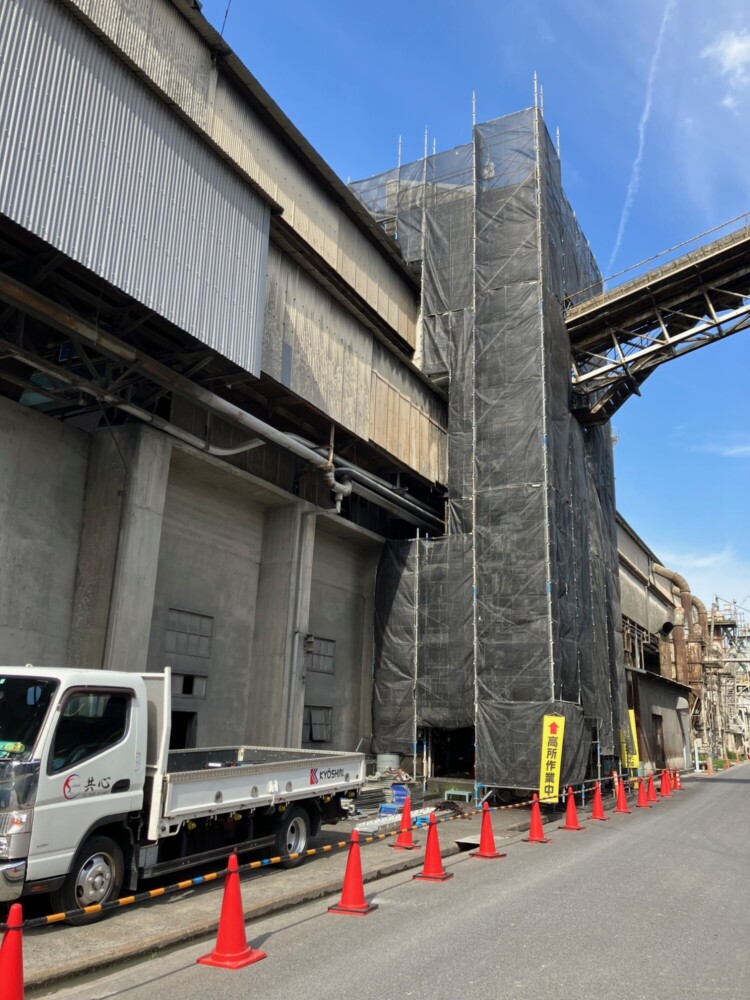 2025年4月8日、山陽小野田市にある某プラント内に於いて、外壁更新及び鉄骨の補修、補強工事に伴う仮設足場の設置工事を施工させて頂きました。この工場は、県内を代表致します、歴史あるセメント製造企業様の一です。