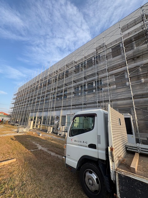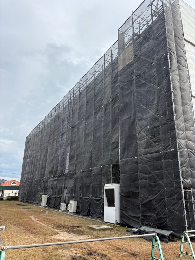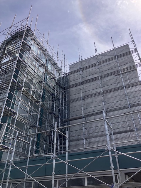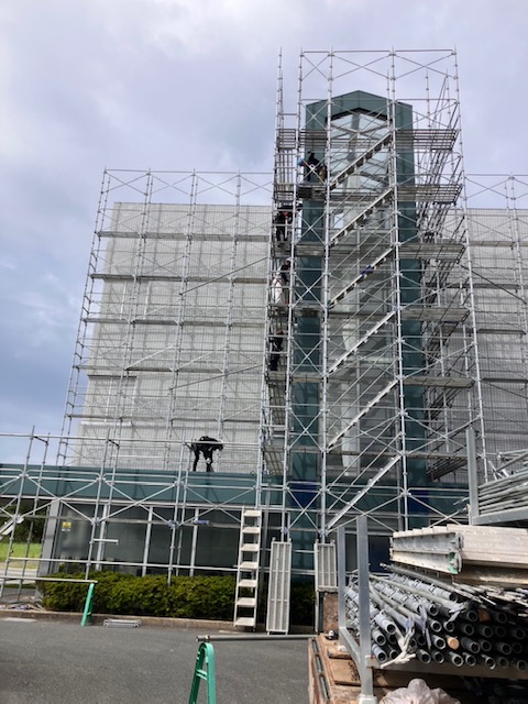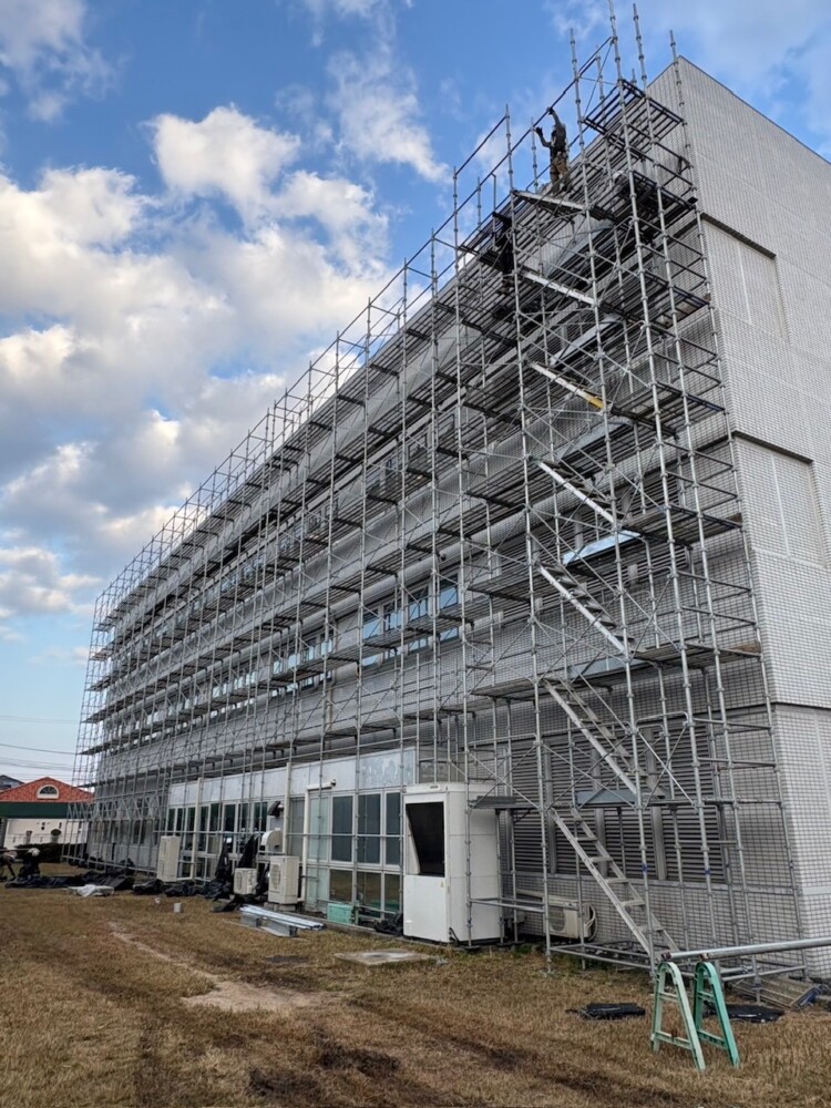 令和7年7月中旬、宇部市に研究センターを置く、某企業様の外壁更新工事に伴う足場仮設工事を弊社で施工させていただきました。